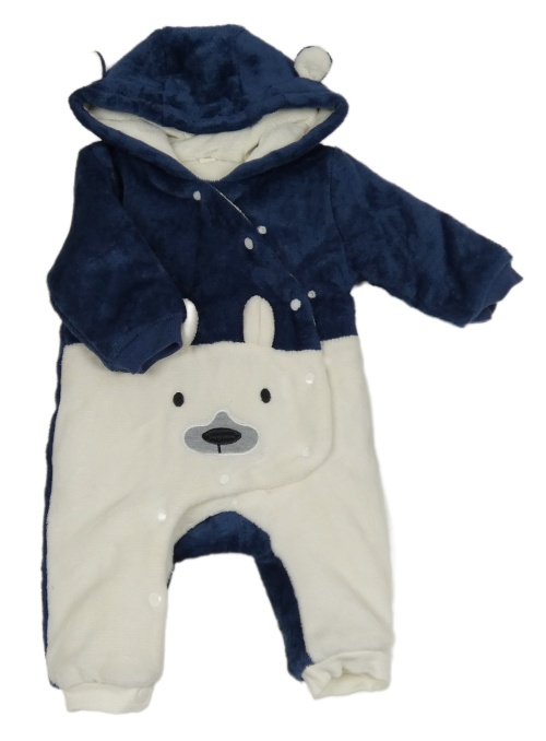 Tmavomodro-biela plyšová zateplená kombinéza s ňufáčikom a kapucňou