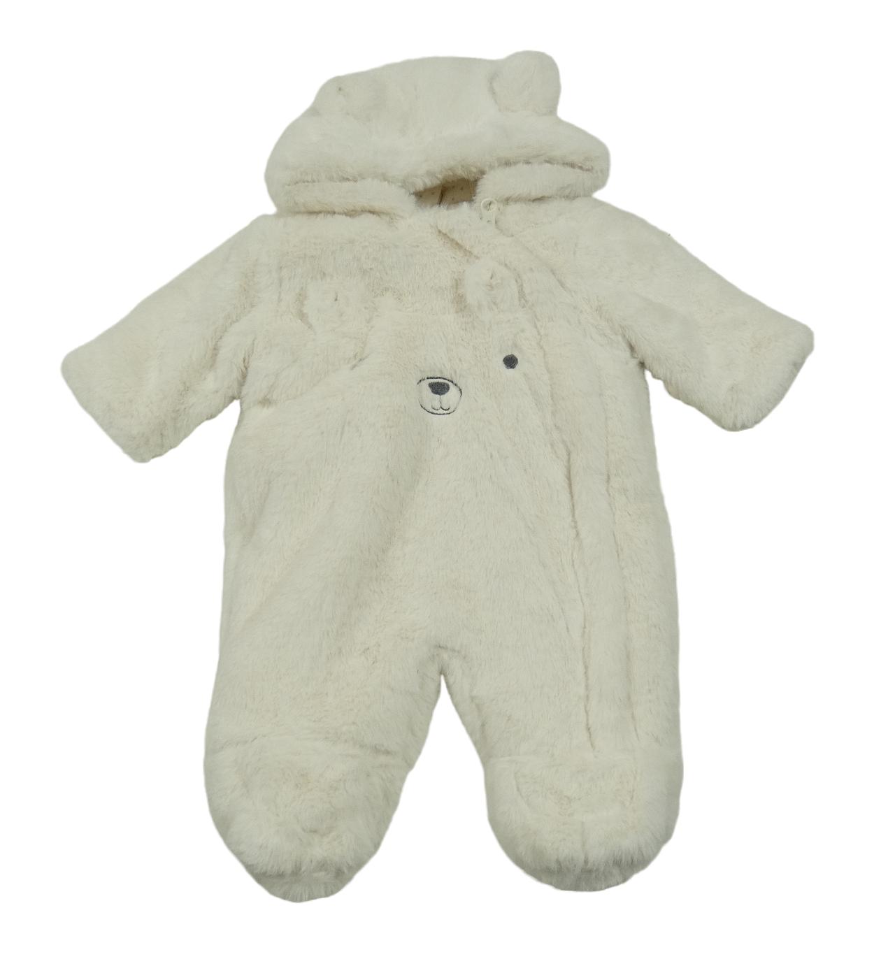 Smotanová kožušinová zateplená kombinéza s medvěďom a kapucňou Nutmeg