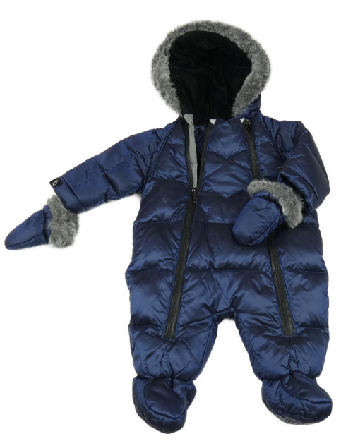 Tmavomodrá prešívaná šušťáková zimná kombinéza s kapucňou s kožešinou + rukavice