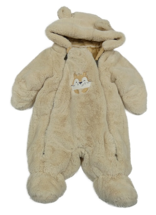 Béžová chlpatá zateplená kombinéza s líškou a kapucňou