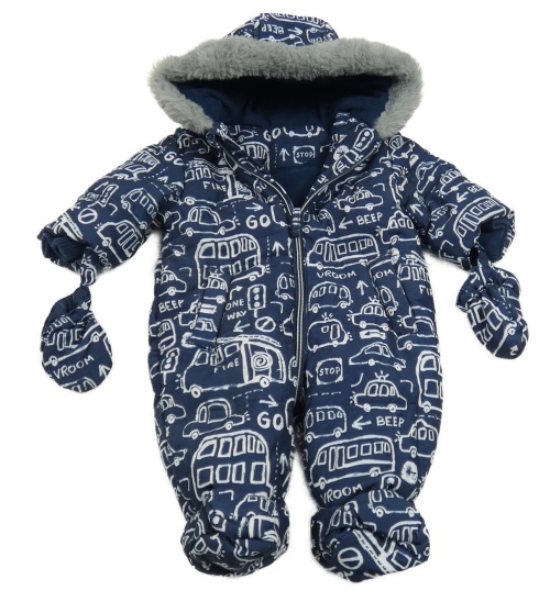 • Tmavomodrá prešívaná šušťáková zimná kombinéza s autami a hasiči a kapucňou s kožešinou + rukavice George
