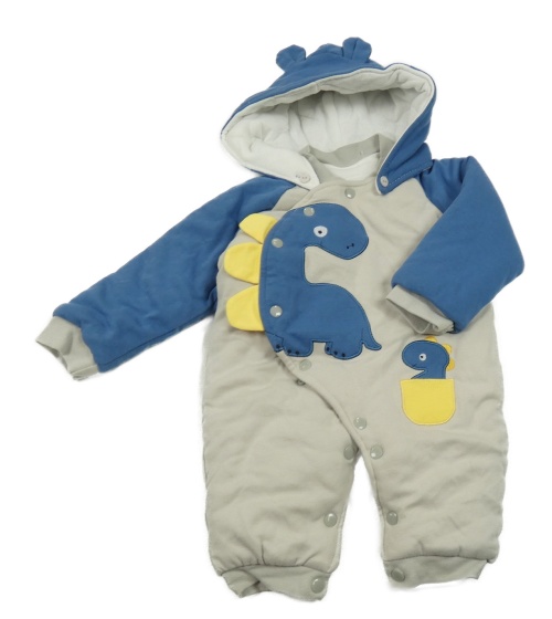 Béžovo-modrá bavlnená zateplená kombinéza s dinosaurom a kapucňou