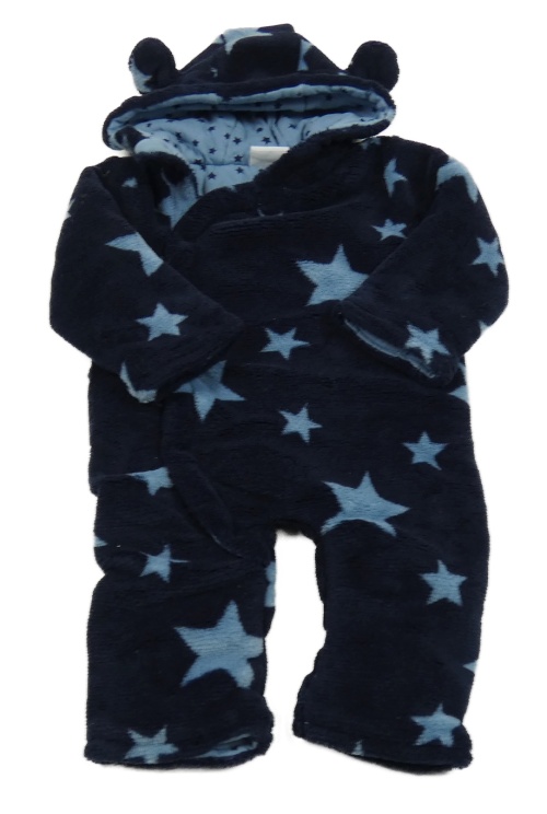 Tmavomodro-modrá plyšová zateplená kombinéza s hviezdami a kapucňou