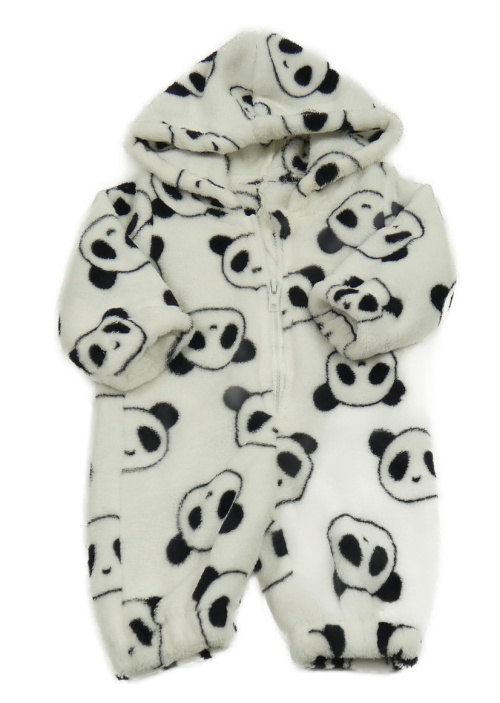 Bielo-čierna plyšová kombinéza s pandami a kapucňou