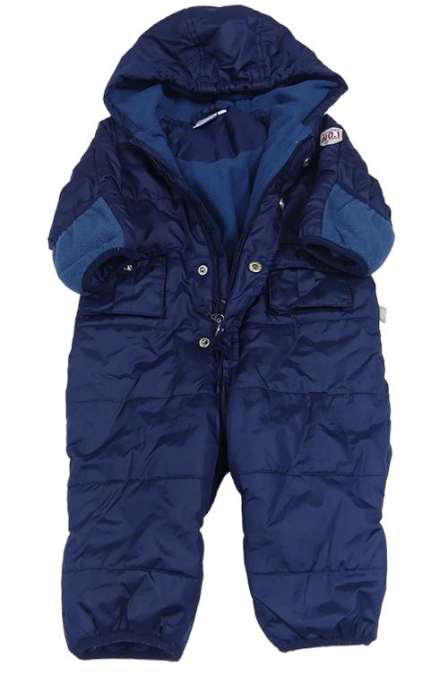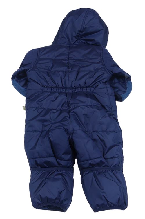 Tmavomodrá prešívaná šušťáková zimná kombinéza s nášivkou a kapucňou impidimpi