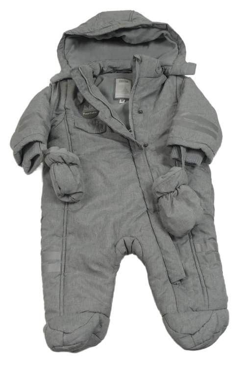 Sivá šušťáková zimná kombinéza s nášivkou a kapucí+ rukavice