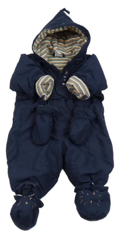 Tmavomodrá šušťáková zimná kombinéza s kapucí + boty + rukavice