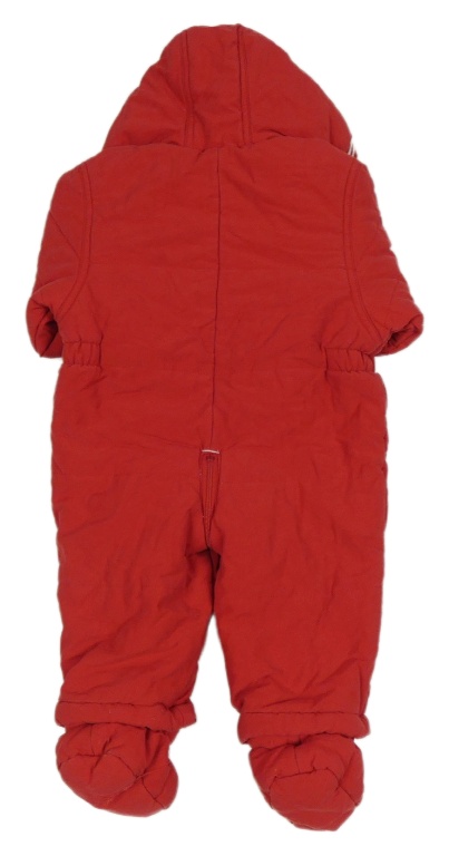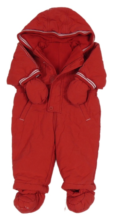 Červená prešívaná šušťáková zimná kombinéza s pruhmi a kapucí + rukavice a cápačky Mothercare