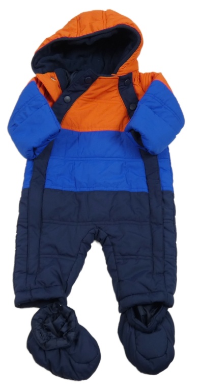 Tmavomodro-safírovo-oranžová šušťáková zimná kombinéza s kapucí + botičky M&S