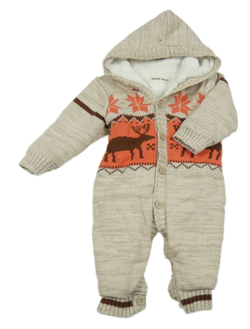 • Světlebéžovo-tmavooranžová melírovaná pletený zateplená kombinéza s jeleňmi a vločkami a kapucňou