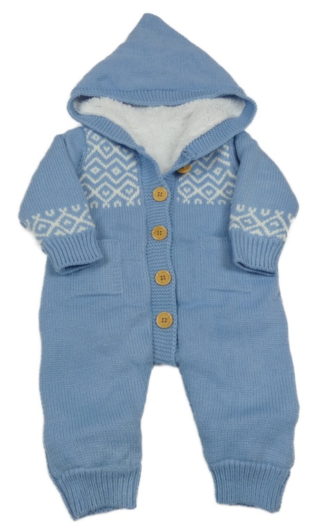 Modrá pletená zateplená kombinéza so vzorem kapucňou