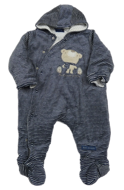 Tmavomodro-biela pruhovaná zamatová zateplená kombinéza s medvěďom a kapucňou