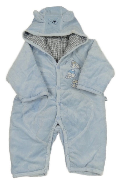 Svetlomodrá zamatová zateplená kombinéza s medvedíkmi a kapucňou