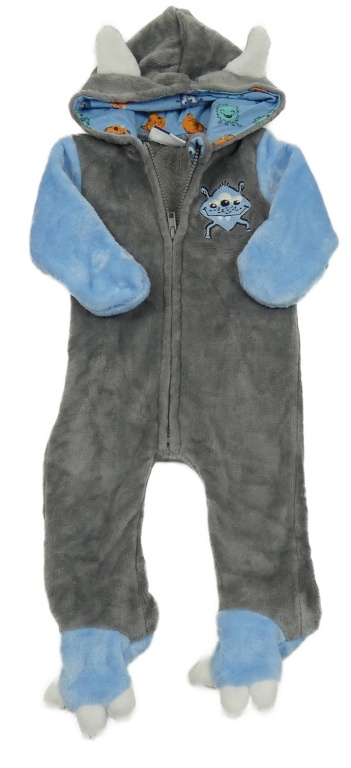 Sivo-modrá plyšová kombinéza s príšerkou a kapucňou