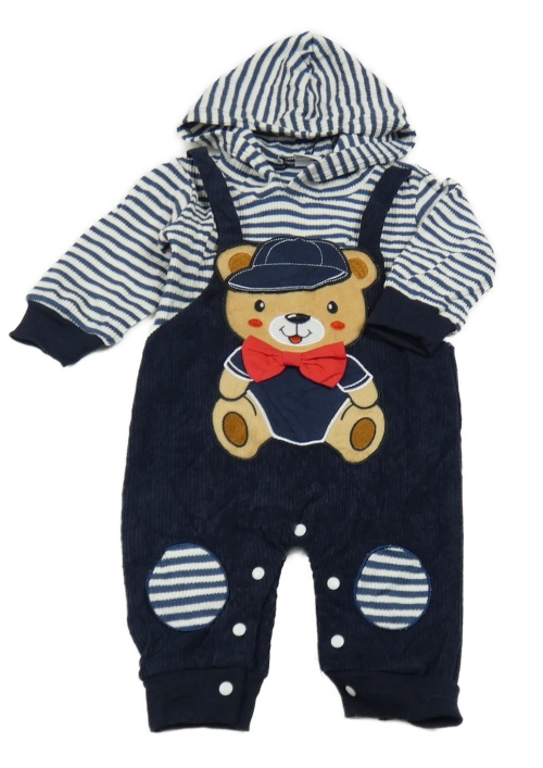 Tmavomodro-pruhovaná manšestrovo/mikinová kombinéza s medvedíkom a kapucňou