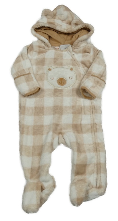 Světlehnědo-biela kockovaná chlpatá kombinéza s medvěďom a kapucňou