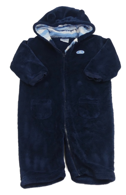 Tmavomodrá chlpatá kombinéza s nášivkou a kapucňou
