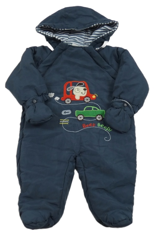Tmavomodrá šušťáková zimná kombinéza s autami a kapucňou