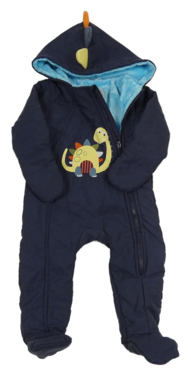 Tmavomodrá prešívaná šušťáková zimná kombinéza s dinosaurom a kapucňou s ostny M&Co