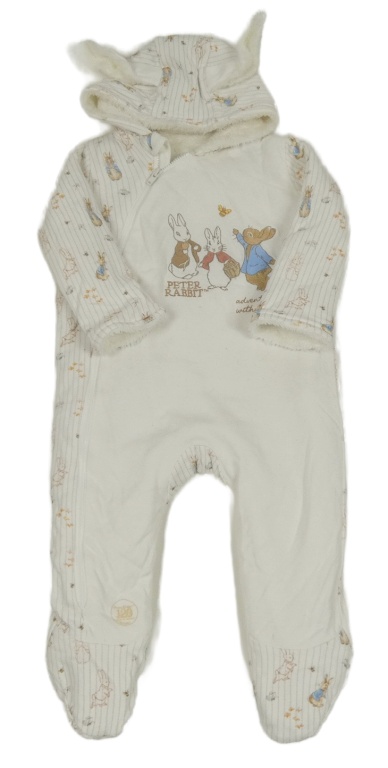 Bielo-sivá zateplená bavlnená kombinéza s pruhmi a králíčky a kapucňou s uškami