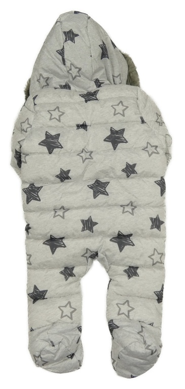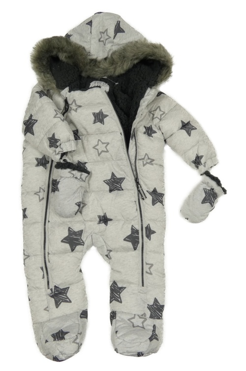Svetlosivá melírovaná šušťáková zimná kombinéza s hviezdami a kapucí + rukavice F&F