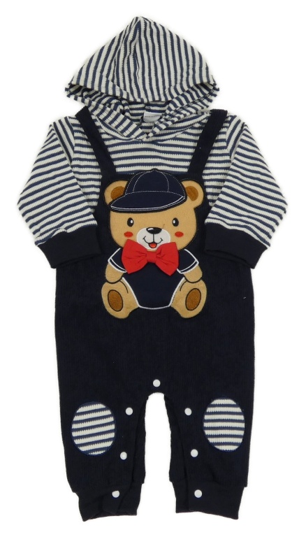 Tmavomodro-biela kombinéza s medvěďom a kapucňou