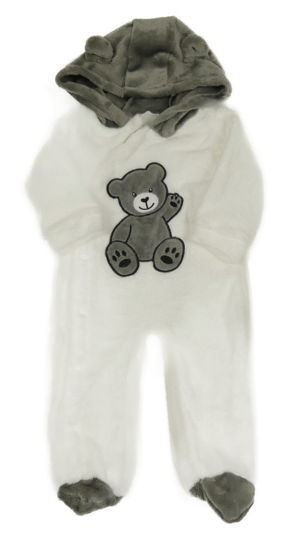 Bielo-sivá plyšová kombinéza s medvěďom a kapucňou