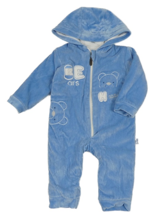 Svetlomodrá rebrovaná zamatová zateplená kombinéza s medvedíkom a kapucňou