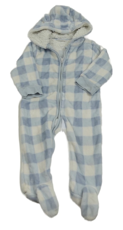 Světlemodro-biela kockovaná plyšová kombinéza s kapucňou