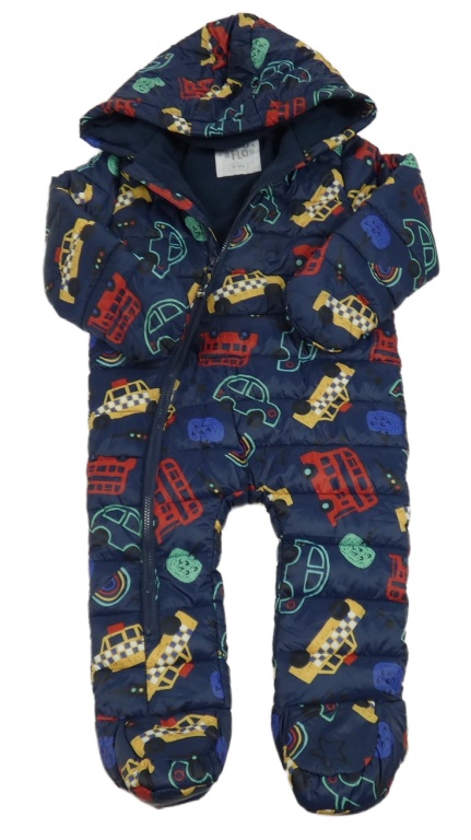 Tmavomodrá šušťáková zimná kombinéza s autami a kapucňou F&F