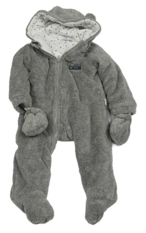 Svetlosivá chlpatá zateplená kombinéza s nášivkou a kapucí+ rukavice