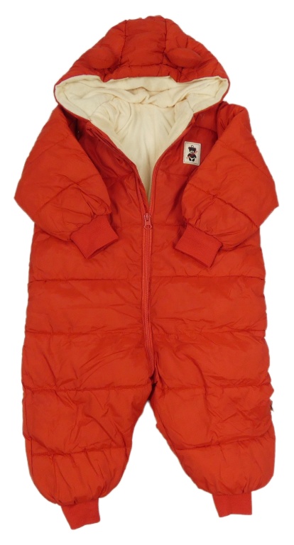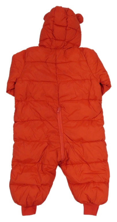 Červená šušťáková zimná kombinéza s medvěďom a kapucňou