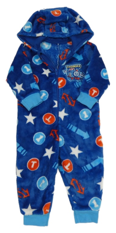 Modrá chlpatá kombinéza s nápismi a kapucí - Mašinka Tomáš
