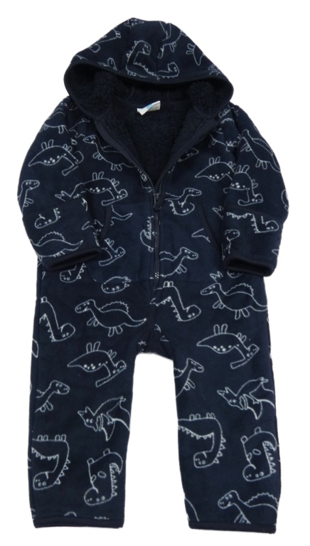 Tmavomodrá fleecová zateplená kombinéza s dinosaurami a kapucňou Topomini