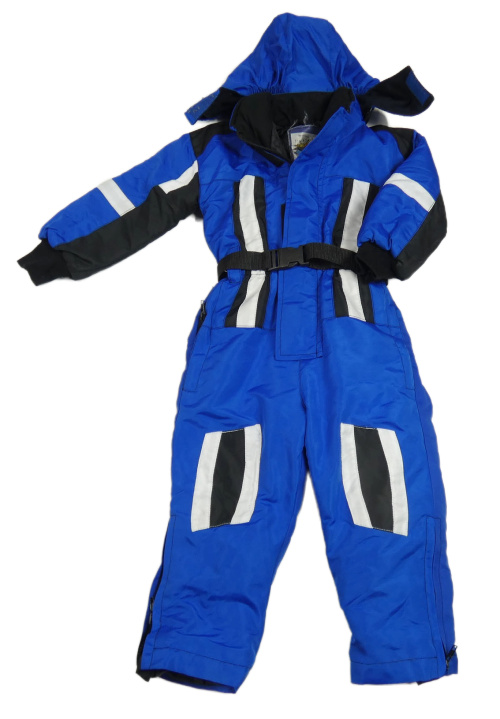 Modro-čierno-biela šušťáková zimná kombinéza s opaskom a kapucňou