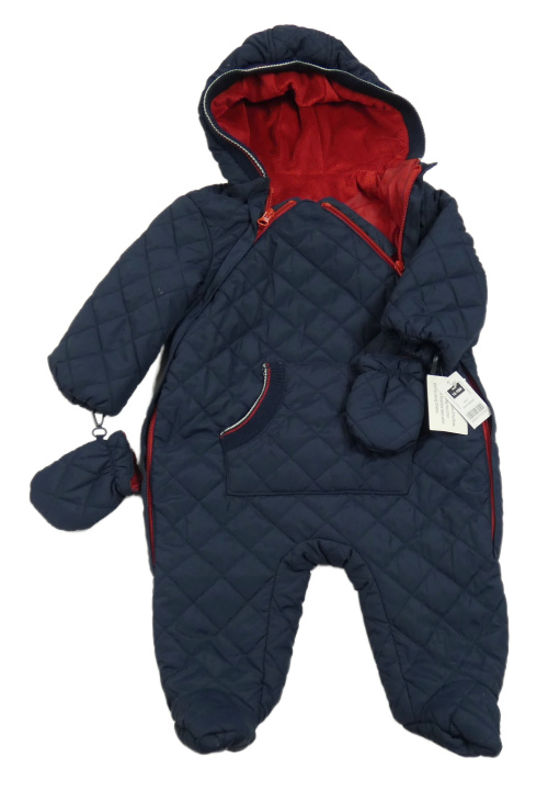 Nové - Tmavomodrá šušťáková prešívaná zateplená kombinéza s kapucí+ rukavice Dunnes