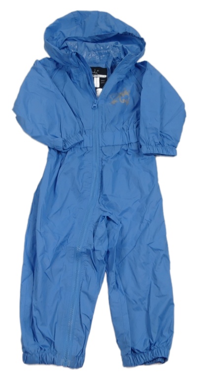 Modrá šušťáková vodeodolná kombinéza s potlačou a kapucňou