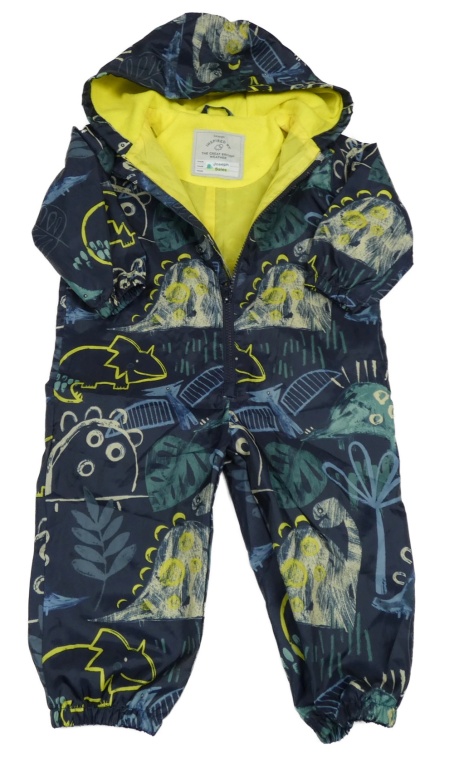 Tmavmodrá šušťáková jarná kombinéza s dinosaurami a kapucňou George