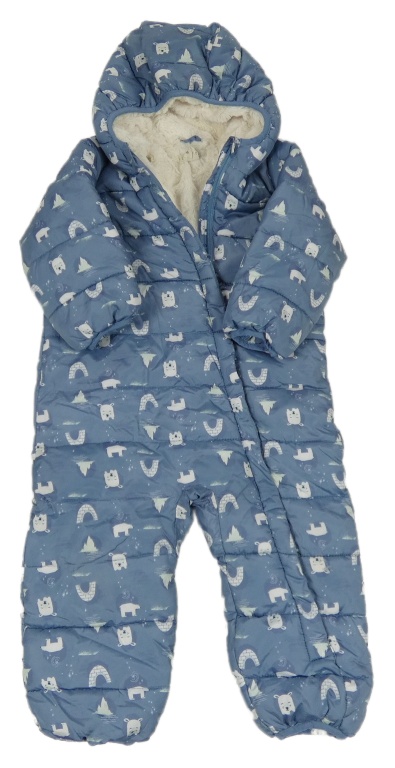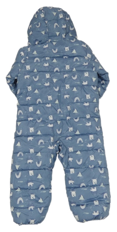 Modrá šušťáková prešívaná zimná kombinéza s medvedíkmi a kapucňou
