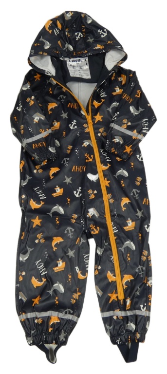 Tmavomodrá nepromokavá kombinéza s delfínky a parníčky a kapucňou lupilu