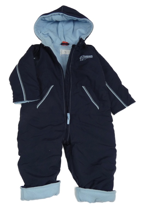 Tmavomodrá šušťáková zimná kombinéza s nápisom a kapucňou Puma