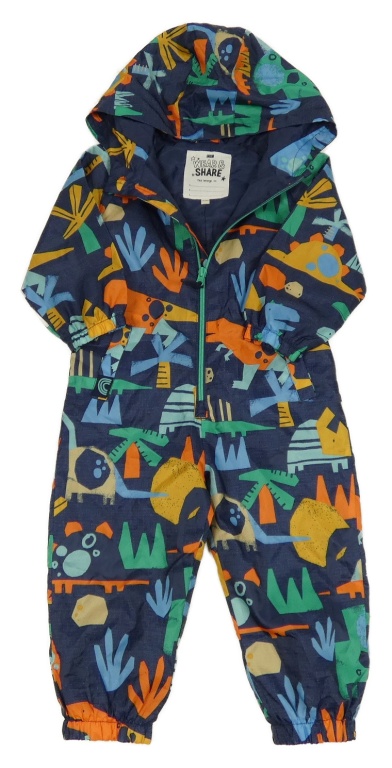 Tmavomodrá melírovaná šušťáková jarná kombinéza s dinosaurami a palmami a kapucňou F&F