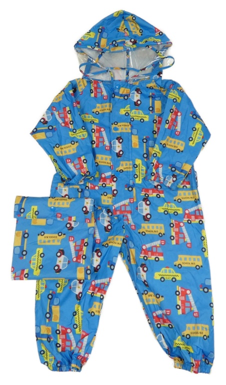 Modrá šušťáková nepromokavá kombinéza s IZS a autobusmi a kapucí + sáček