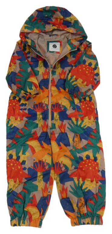 Béžová šušťáková jesenná kombinéza s dinosaurami a kapucňou Tu