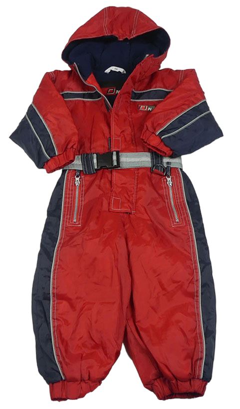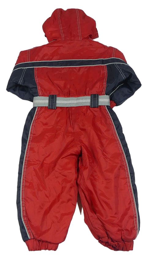 Červeno-tmavomodrá šušťáková zimná kombinéza s nášivkou a opaskom a kapucňou