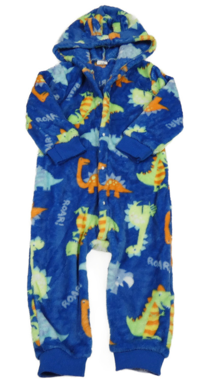 Modrá chlpatá kombinéza s dinosaurami a kapucňou