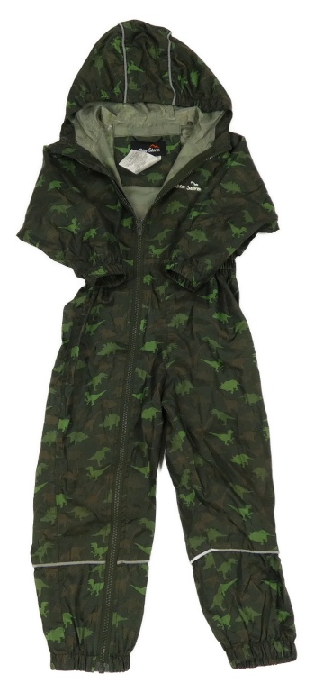Khaki šušťáková nepromokavá kombinéza s dinosaurami a kapucňou Peter Storm