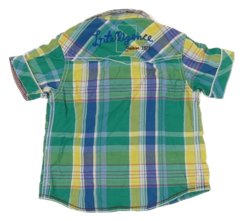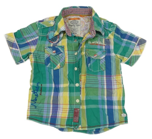 Zeleno-modro-žltá kockovaná košeľa s nápismi