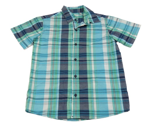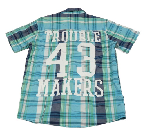Tmavomodro-zeleno-modro-biela kockovaná košeľa s číslom a nápismi MANA