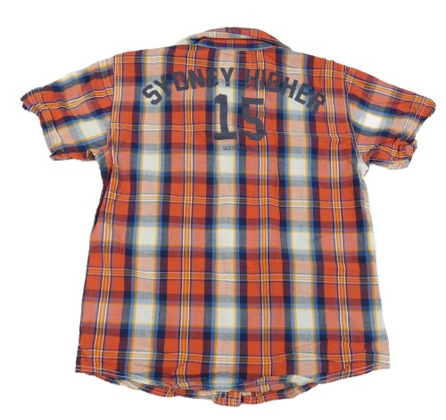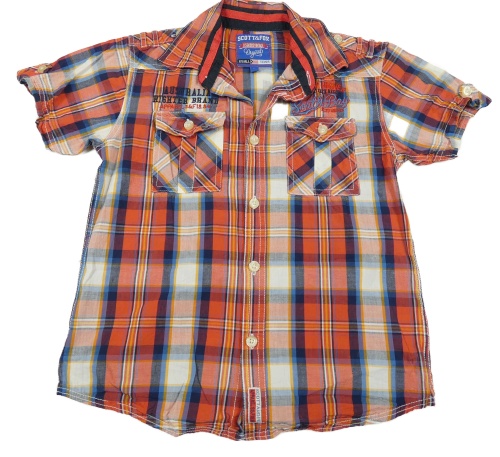 Červeno-bielo-modrá kockovaná košeľa s číslom a nápismi
